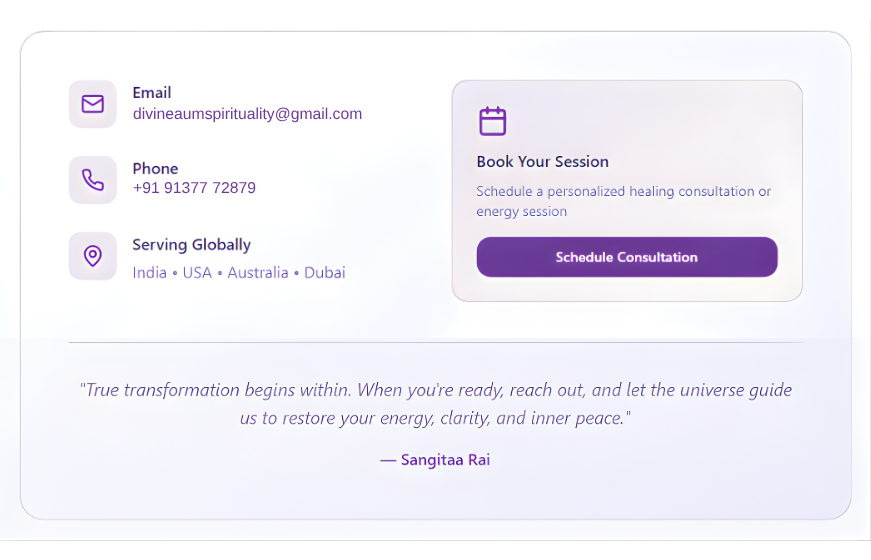 Everybody deserves to Heal & Shine Healing energy is not only for those who are struggling — it is for everyone seeking balance, peace, and a deeper connection with their soul. Even happy and healthy individuals can use energy healing to maintain a joyful and harmonious life. Through divine guidance and ancient practices like mantra healing, chakra meditation, and vastu clearance, one can awaken inner light and live with calm, clarity, and purpose. When your body, mind, and spirit align, you naturally attract abundance, love, and happiness into your life. ~ Sangitaa Rai, Master MEV & MER Healer, Spiritual Teacher & Guide